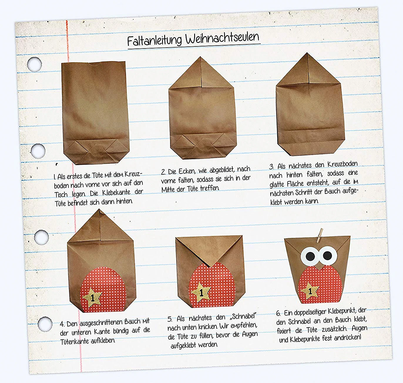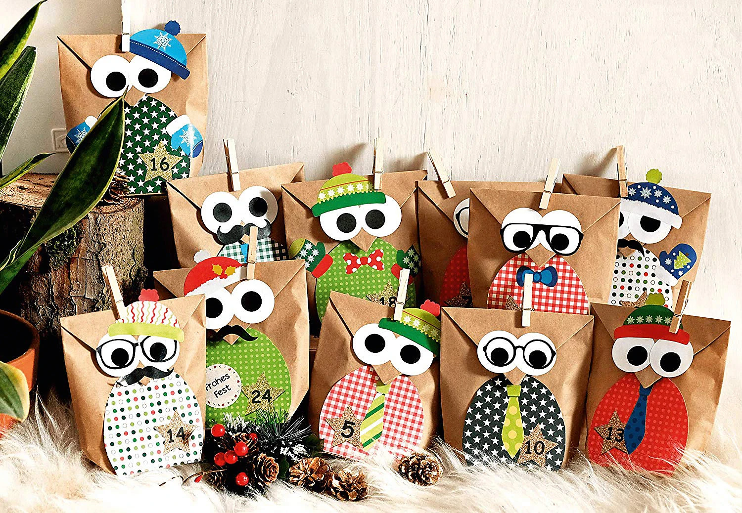 Mit diesem Set haben Sie alles parat, was Sie zum Gestalten eines individuellen Adventskalenders brauchen. Zudem sorgt es für eine spaßige vorweihnachtliche Aktivität, denn beim Basteln, Dekorieren und Befüllen der hübschen Eulentüten kommt die ganze Familie zusammen! Auch die Kleinsten können mitmachen, schließlich wird keine Schere benötigt, denn alle Teile sind praktischerweise vorgestanzt und lassen sich ganz einfach aus der Form heraustrennen. Besonders viel Spaß macht es, die Eulen mit den vielen Aufklebern individuell zu dekorieren, zum Beispiel mit einer Brille, schicken Handschuhen oder einer Krawatte!