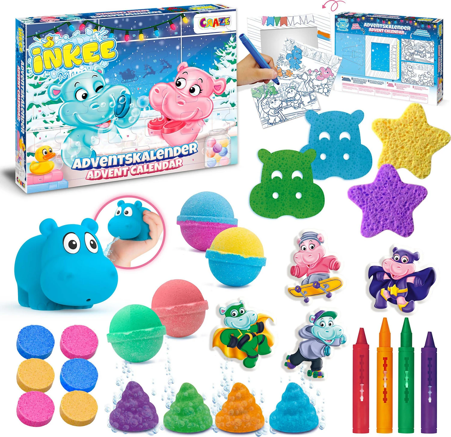 Der Badespaß kann kommen mit dem INKEE Hipo Adventskalender von CRAZE. Vierundzwanzig coole, lustige und bunte Überraschungen warten jeden Tag auf dich und machen die wöchentliche Badesession zu einem wahren Spielerlebnis. Badebomben, Schwämme und weitere coole Spielsachen warten darauf, endlich gemeinsam mit dir in die Wanne steigen zu können.