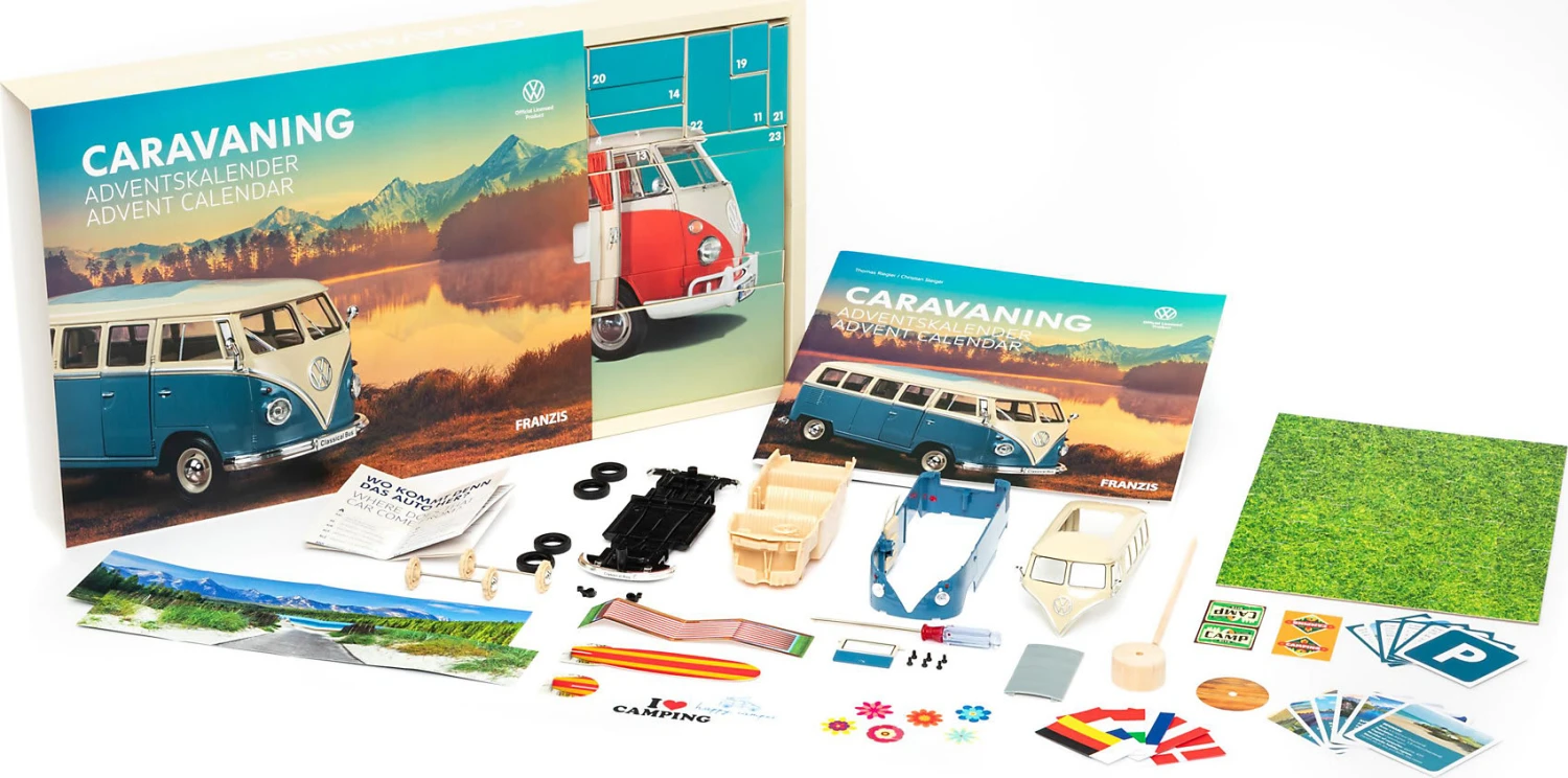 Wer kennt ihn nicht, den Klassiker vieler Reisefreudiger? Der VW Bulli T1 hat mit seiner Vielseitigkeit und Zuverlässigkeit den Trend zu Caravaning und Camping mitbegründet. Mit diesem Adventskalender kommt ein tolles Bauprojekt für alle T1-Fans mit einem 8-teiligen Bausatz und vielem mehr. Das großformatige Begleitbuch begeistert die Fans mit vielen Informationen und historischen Fotos. Das fertige Modell ist ein richtiger Hingucker in jeder Sammlung!