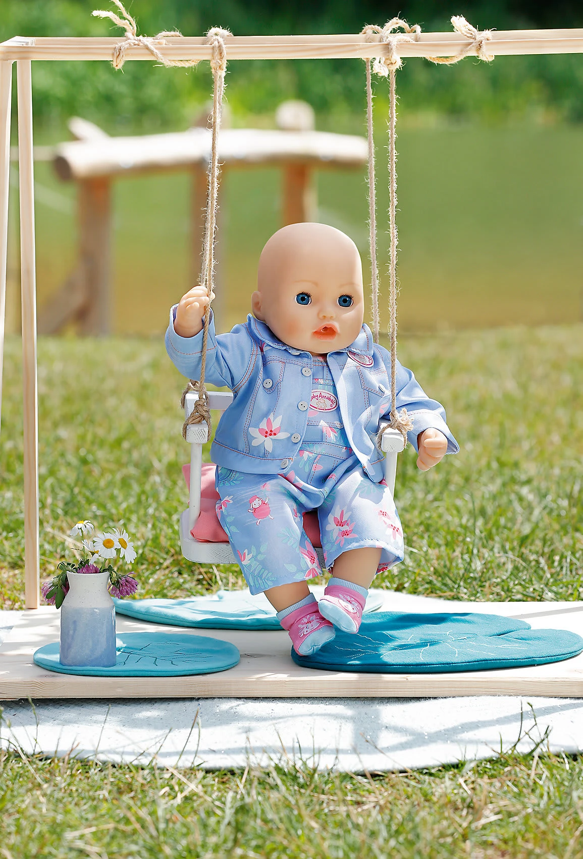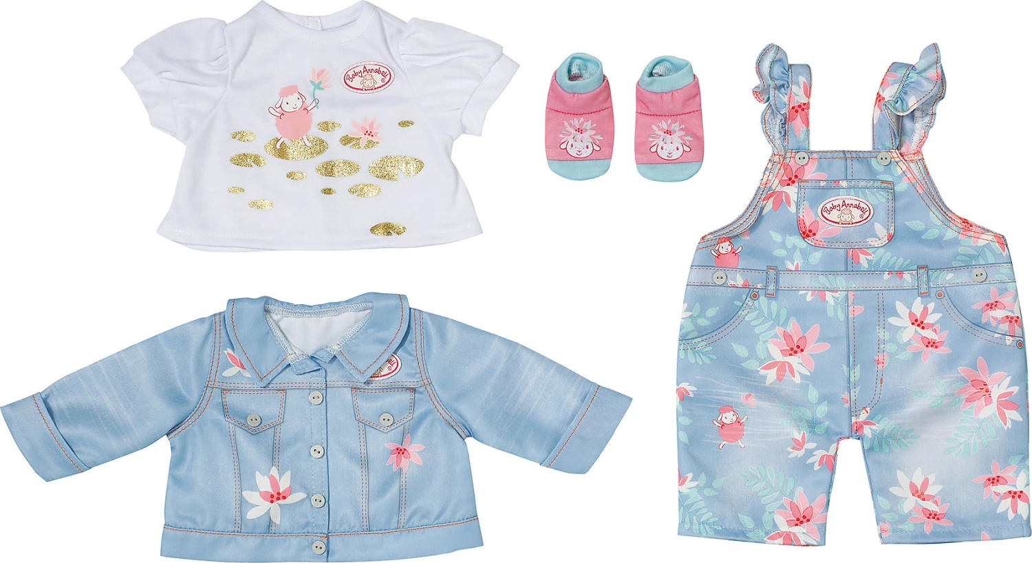 Mit dem Jeans-Outfit von Zapf sind die Baby Annabell Puppen schnell und einfach angezogen. Baby Annabell Active Deluxe Jeans 43cm von Zapf aus Jacke, Shirt, Hose und Socken passend für Baby Annabell Puppen bis 43cm Das nette Outfit ist ideal für Baby Annabell Puppen mit einer Größe von 43 Zentimetern. Damit die Puppen gut für den Tag angezogen sind, besteht das Set aus Jeans-Jacke und Jeans-Latzhose mit Blumen-Muster, sowie passendem Shirt und Socken.