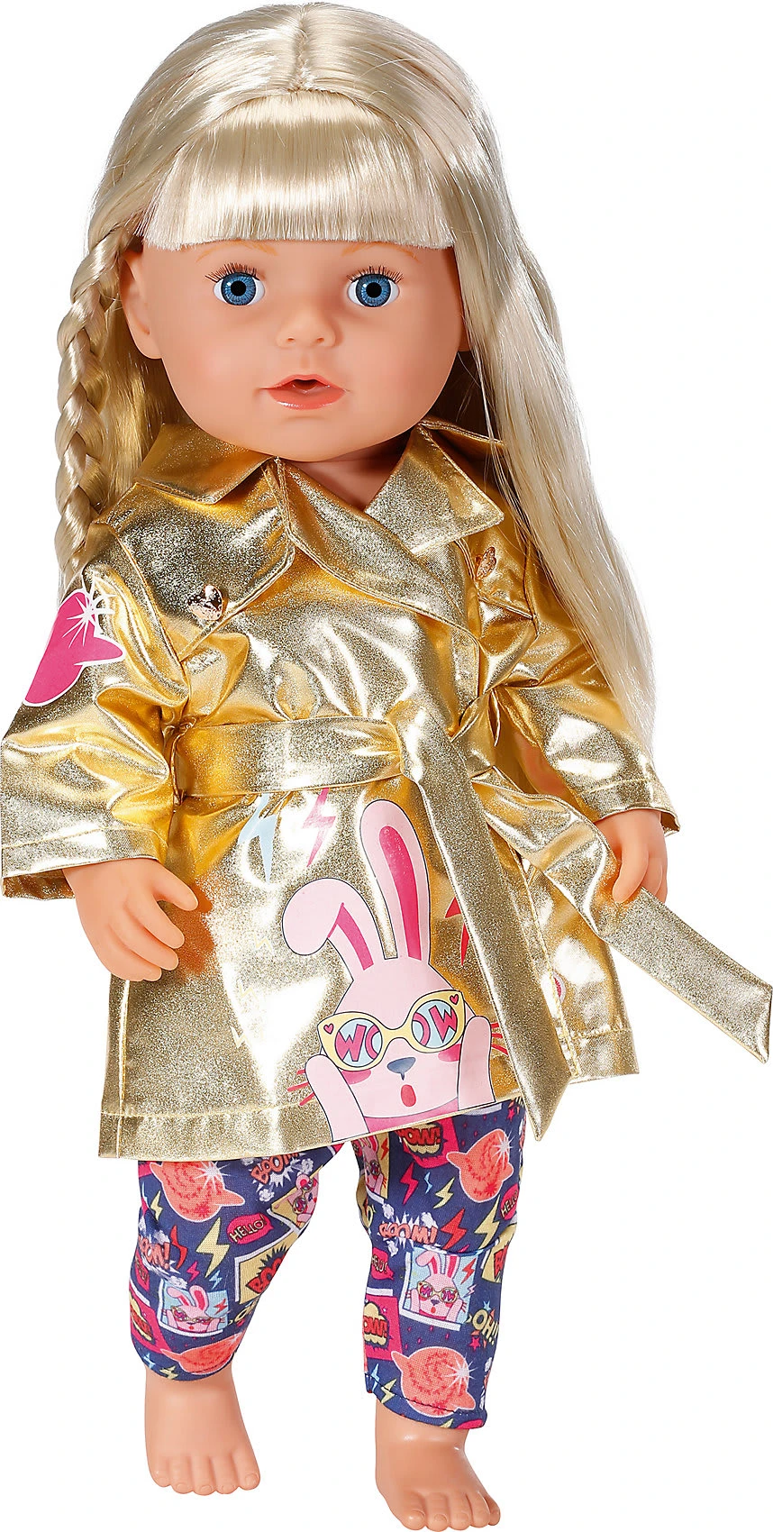 Wir würden BABY born mit ihren 30 Puppenjährchen noch nicht als Golden Girl bezeichnen, aber in diesem Outfit passt das einfach. Zu ihrem Geburtstag präsentiert sich die kleine Trendsetterin in einem goldenen Trenchcoat. Trench ist schließlich Trend. Dazu trägt sie eine bunte Hose mit Cosmic-Comic-Print. Das auffällige Muster nennt sich cartoon to the moon. Hochwertige Kleidung für die BABY born Markenspielpuppe. Für erweitertes, abwechslungsreiches und langanhaltendes Spielvergnügen. Kinderleichtes An- und Ausziehen. BABY born Happy Birthday Mantel 43cm aus Jacke und Hose. Inkl. Kleiderbügel.