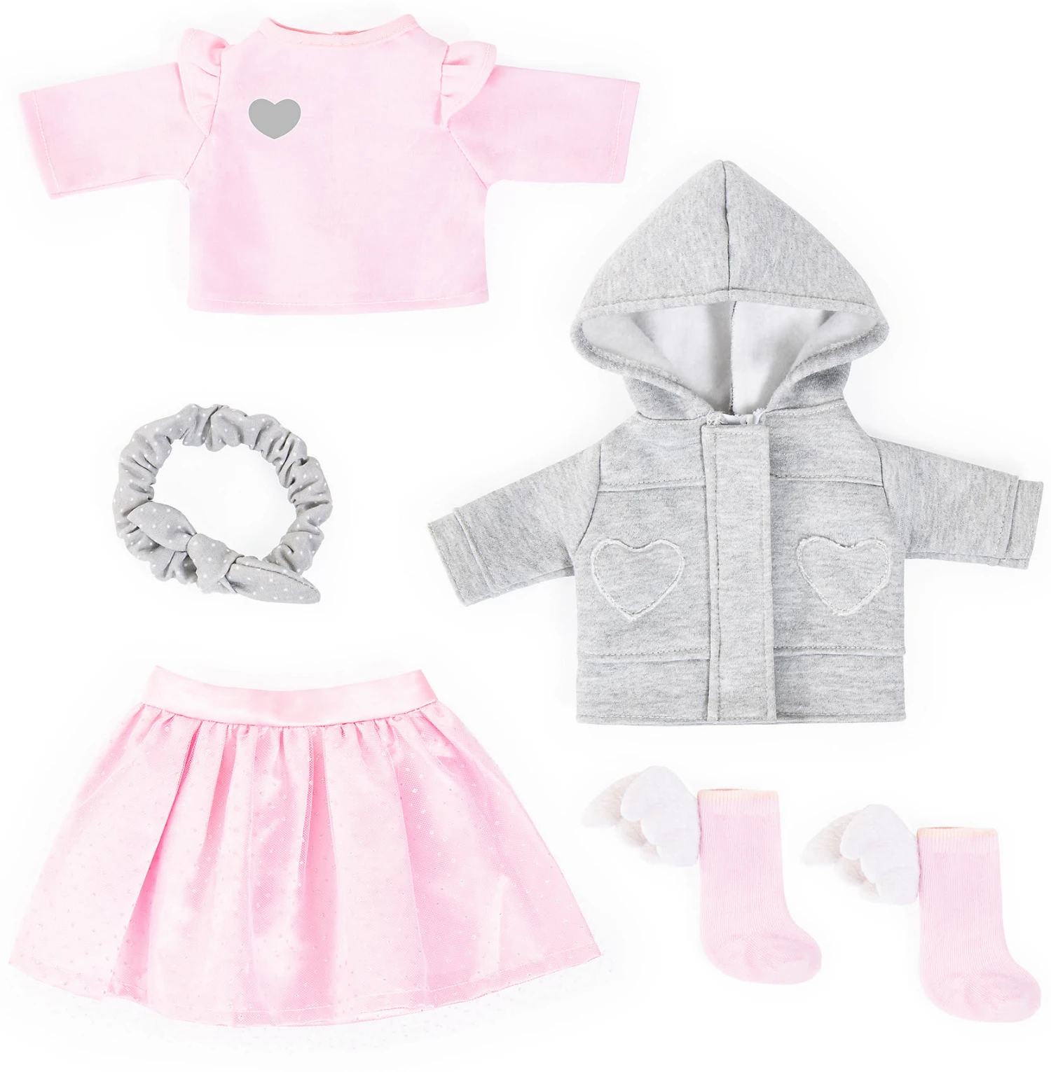 Mit diesem Deluxe Puppenkleidung-Set aus der myToys-COLLECTION von Bayer ist die Lieblingspuppe komplett eingekleidet! Alle Kleidungsstücke sind verspielt und mit niedlichen Details gestaltet. Ein besonders tolles Detail sind die Flügelchen an den Socken. So ergeben sich zahlreiche Kombinationsmöglichkeiten und die Puppe kann immer wieder neu eingekleidet werden. Durch das Anziehen trainieren Kinder zugleich ihre Fingerfertigkeit.