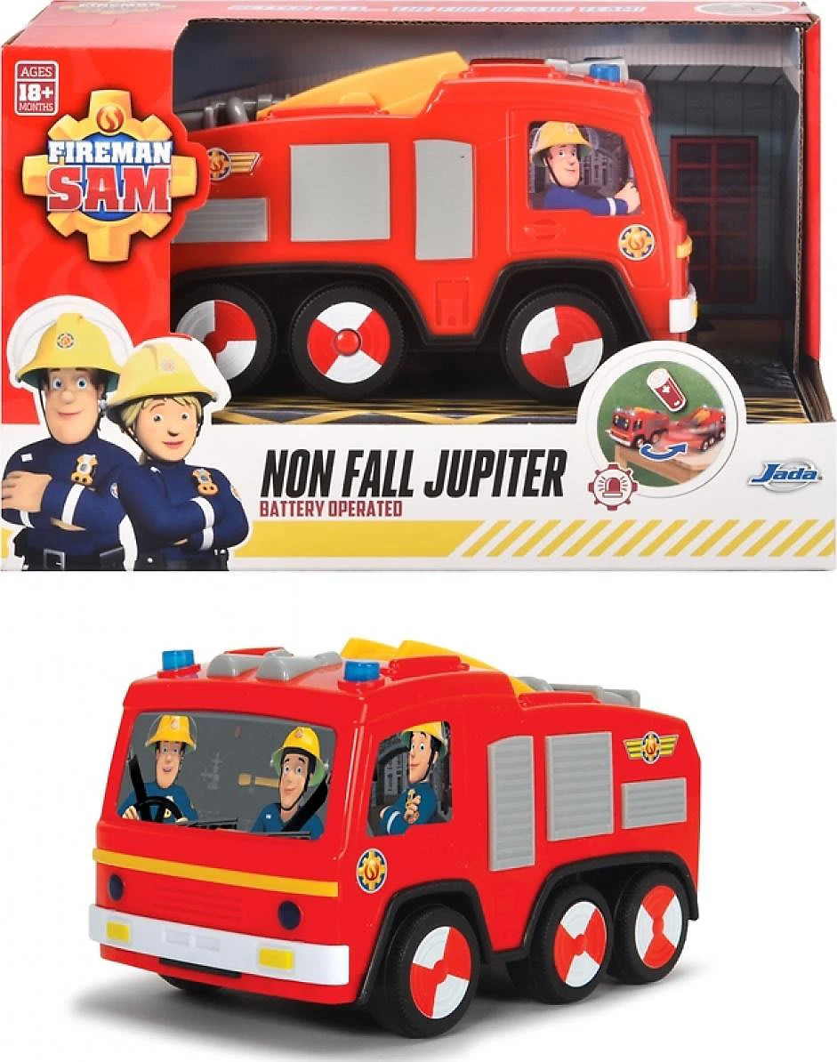 Mit Feuerwehrmann Sam und Kollegen auf Einsatz: Das Feuerwehrauto Sam Non Fall Jupiter von Dickie Toys darf in der Spielesammlung von Brandschutzhelden ab 18 Monaten nicht fehlen! Feuerwehrauto Sam Non Fall Jupiter von Dickie Toys mit Runterfall-Stop und Lichteffekten 14 cm groß Batterien (2xAAA) im Lieferumfang enthalten ab 18 Monaten geeignet Wer Feuerwehrmann Sam bei der Arbeit einmal begleiten will, ist hier genau richtig. Das Spielzeug-Feuerwehrauto Jupiter überzeugt mit blau leuchtendem Toplicht und eingebautem Runterfall-Stop. Dein kleiner Brandschutzheld kann das Fahrzeug also auch auf dem Tisch herumdüsen lassen, ohne dass es auf den Boden fällt. Praktisch: Die zwei benötigten AAA-Batterien sind bereits im Lieferumfang enthalten. So kann es direkt zum nächsten Einsatzort gehen.