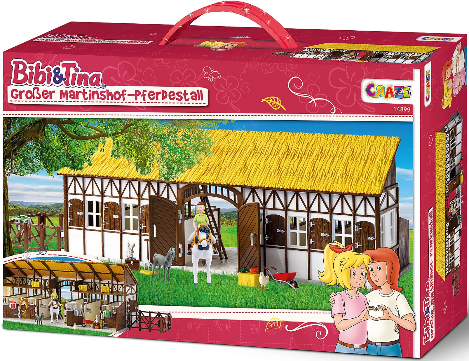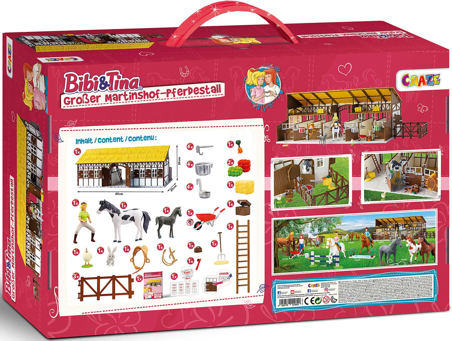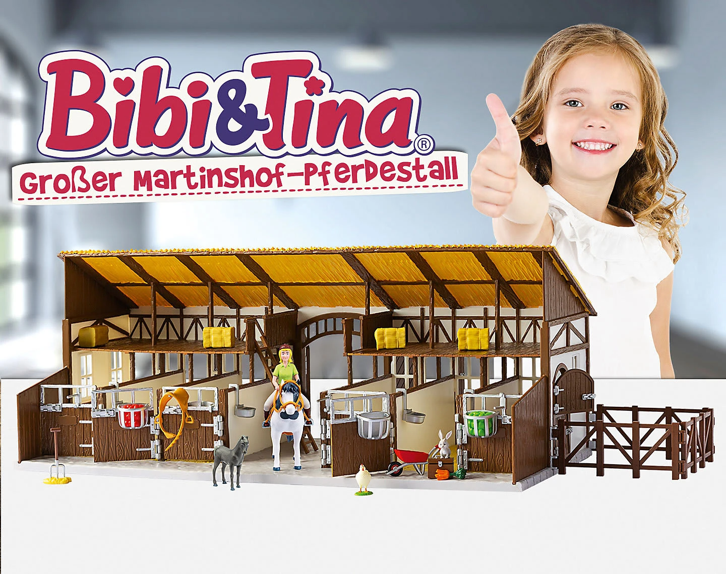 Mit dem BIBI & TINA Martinshof können kleine Möchtegernhexen ganz viele tolle Abenteuer bestreiten. Der Hof kommt mit insgesamt 6 Pferdeboxen und ganz viel tollem Zubehör wie zum Beispiel Hoftieren, Heuballen, Pflegeutensilien wie Putzkoffer und Striegel, einer Schubkarre, einer Heugabel und vielem mehr.