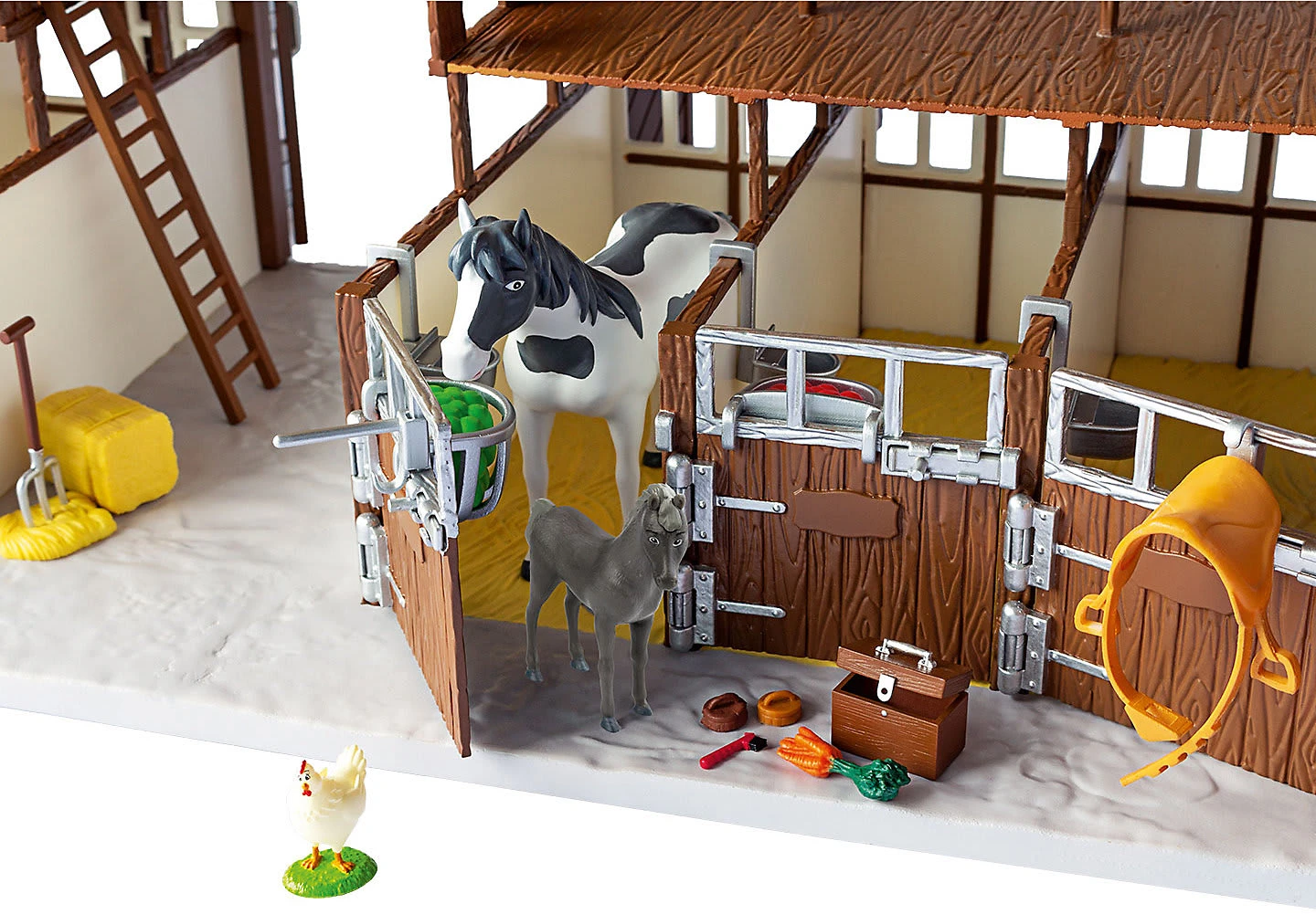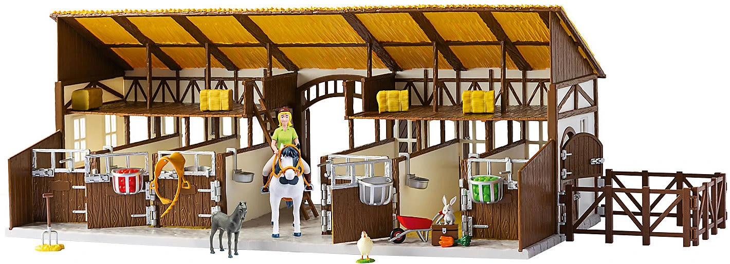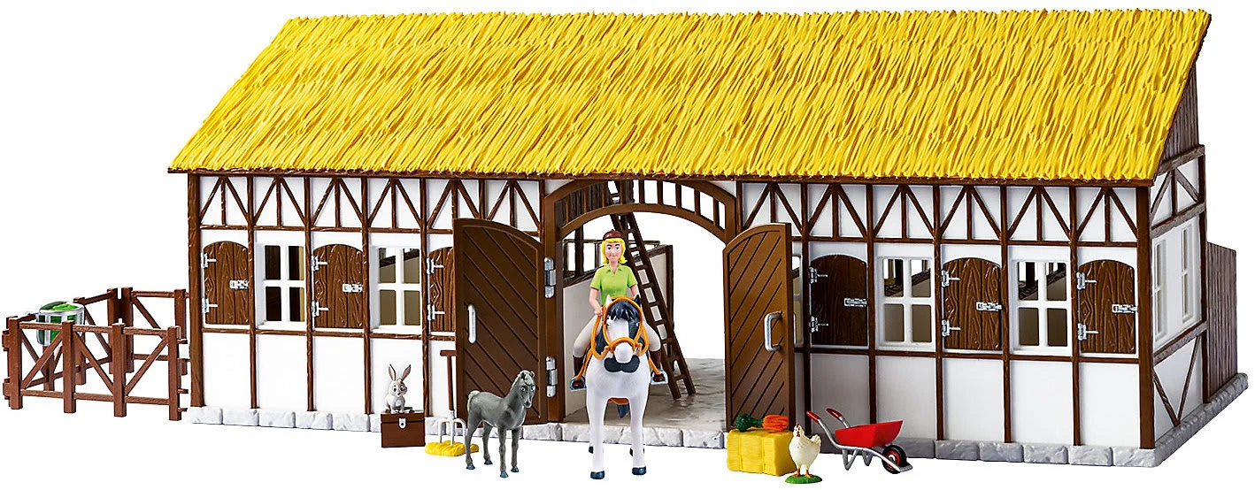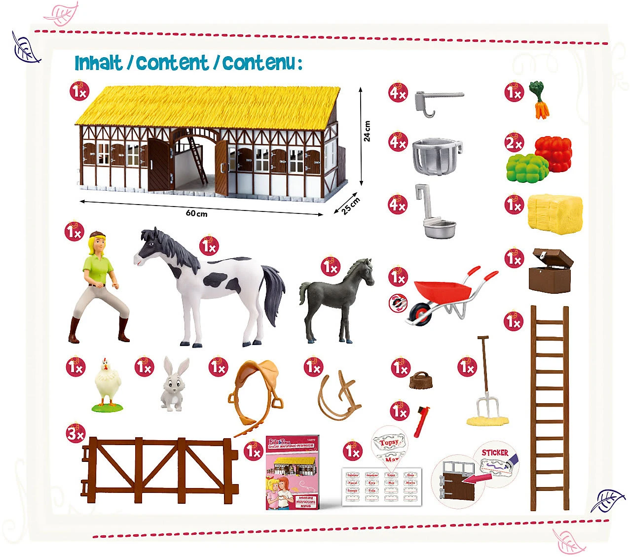 Mit dem BIBI & TINA Martinshof können kleine Möchtegernhexen ganz viele tolle Abenteuer bestreiten. Der Hof kommt mit insgesamt 6 Pferdeboxen und ganz viel tollem Zubehör wie zum Beispiel Hoftieren, Heuballen, Pflegeutensilien wie Putzkoffer und Striegel, einer Schubkarre, einer Heugabel und vielem mehr.