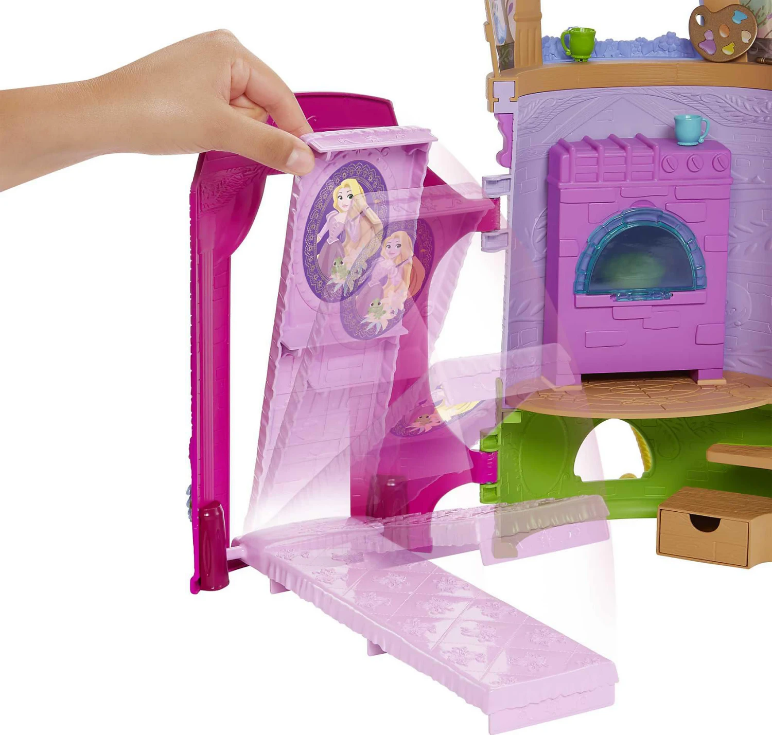 Märchenhaften Spielspaß bietet dieses Set von Mattel. Im Look von Rapunzels Turm aus dem Disneyfilm „Rapunzel – neu verföhnt“ werden Kinderträume war. Hier kann sich die beliebte Prinzessin so richtig austoben. Egal ob malen, backen oder schaukeln. Das umfangreiche Zubehör hat viel zu bieten. Das Bett kann ganz nach Bedarf aus- oder eingeklappt werden und auch ein Bücherregal fehlt hier natürlich nicht.