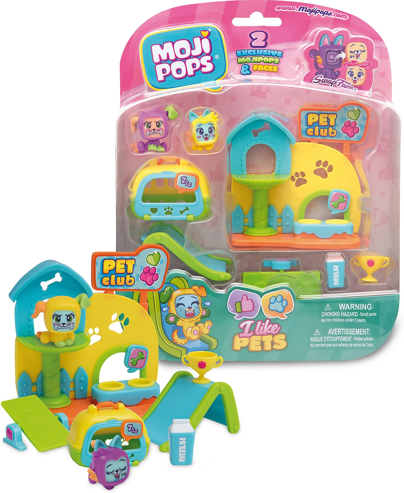 Die niedlichen „MojiPops“ sorgen bei Kindern für so viel Begeisterung! Die Stimmung der tollen Figuren lässt sich im Handumdrehen ändern, indem einfach die Gesichter ausgetauscht werden. Mit dem umfangreichen „I Like Pets“ Spiel-Set von ASS werden Kinder zu vielen lustigen und spannenden Geschichten inspiriert, die sie dann mit den Figuren nachspielen können. Dank der wechselbaren Gesichter kann die Stimmung der „MojiPops“ optimal an verschiedene Situationen angepasst werden. Mit diesem tollen Spiel-Set ist tierischer Spaß garantiert – denn im „Pet Club“ können die Figuren mit den Tieren trainieren, rutschen, spielen und kuscheln.