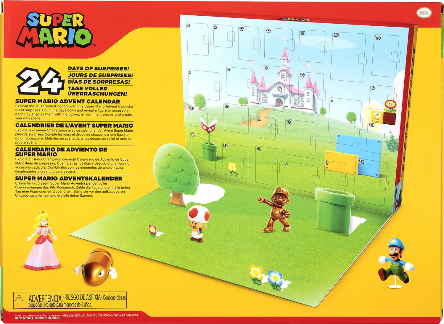 Der Adventskalender „Super Mario & Co.“ von Jazwares bietet den kleinen Fans der beliebten Klempner- Brüder jede Menge tolle Überraschungen! Damit man auch ohne Bildschirm mit den Lieblingscharakteren spielen kann, sind hier siebzehn Charaktere aus den „Super Mario“-Games sowie sieben tolle Accessoires enthalten. Inhalt: 17 Figuren 7 Zubehörteile Figurenmaße: ca. 6,5 cm Altersempfehlung: ab 3 Jahren