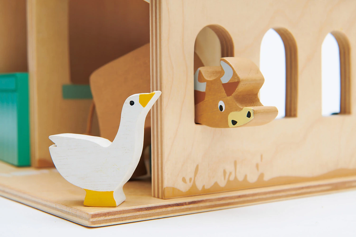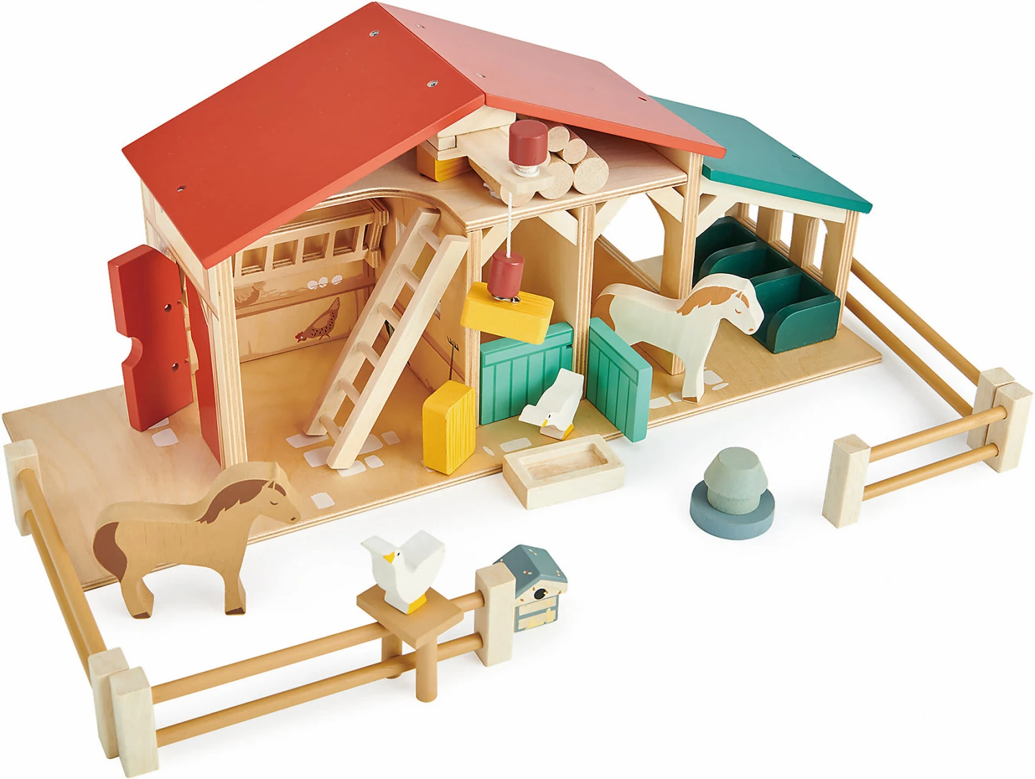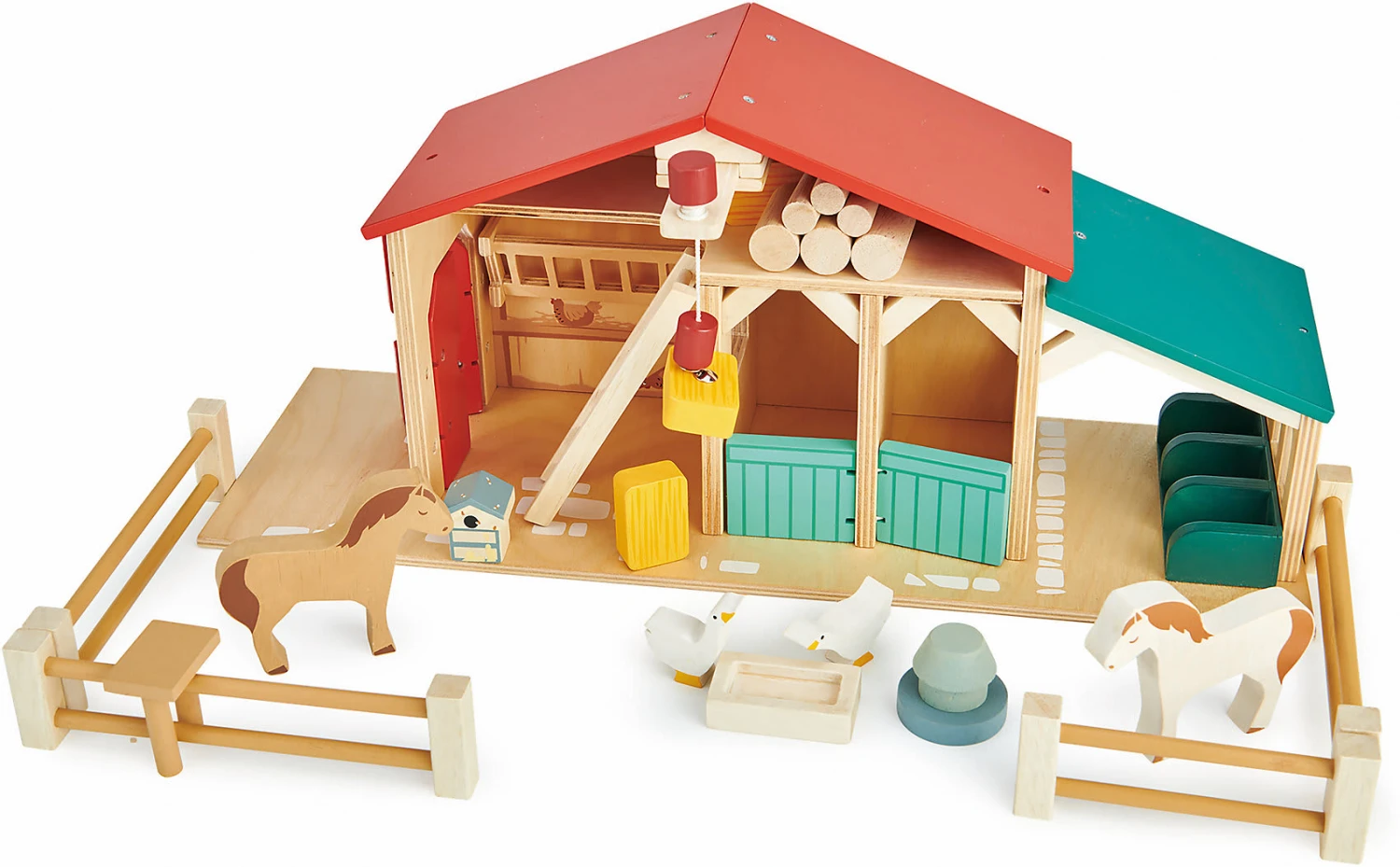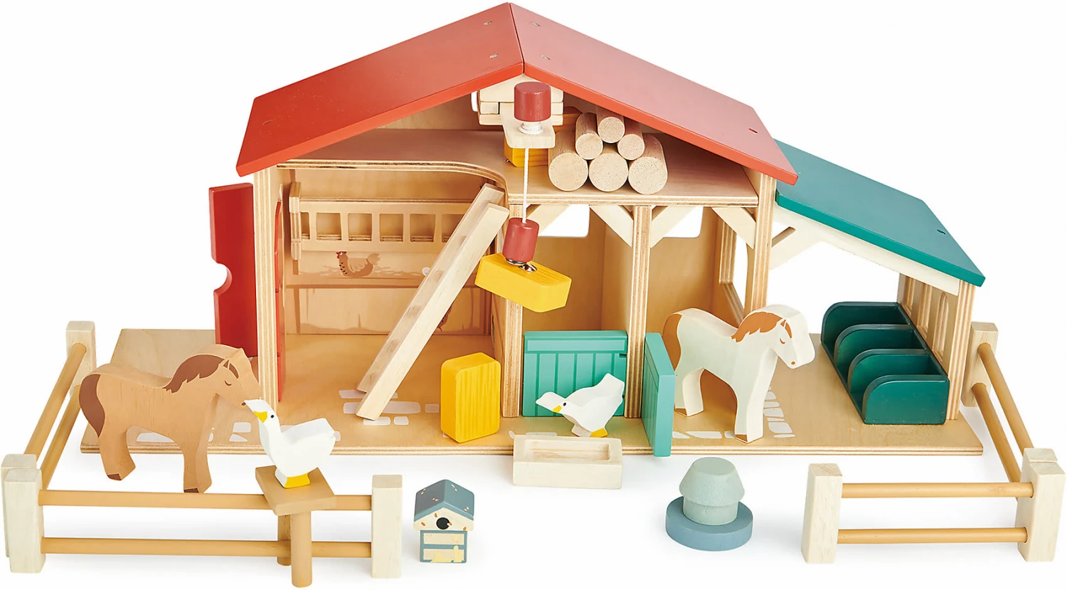 Das große Spielset „Bauernhof“ von tender leaf toys begeistert Kinder mit besonders zahlreichem Zubehör! Die Scheune mit Heuboden, Leiter, magnetischem Flaschenzug und integrierten Ställen bietet jede Menge Raum für fantasievolle Spielideen. Hier werden die Gänse und Pferde einfach klasse versorgt!
